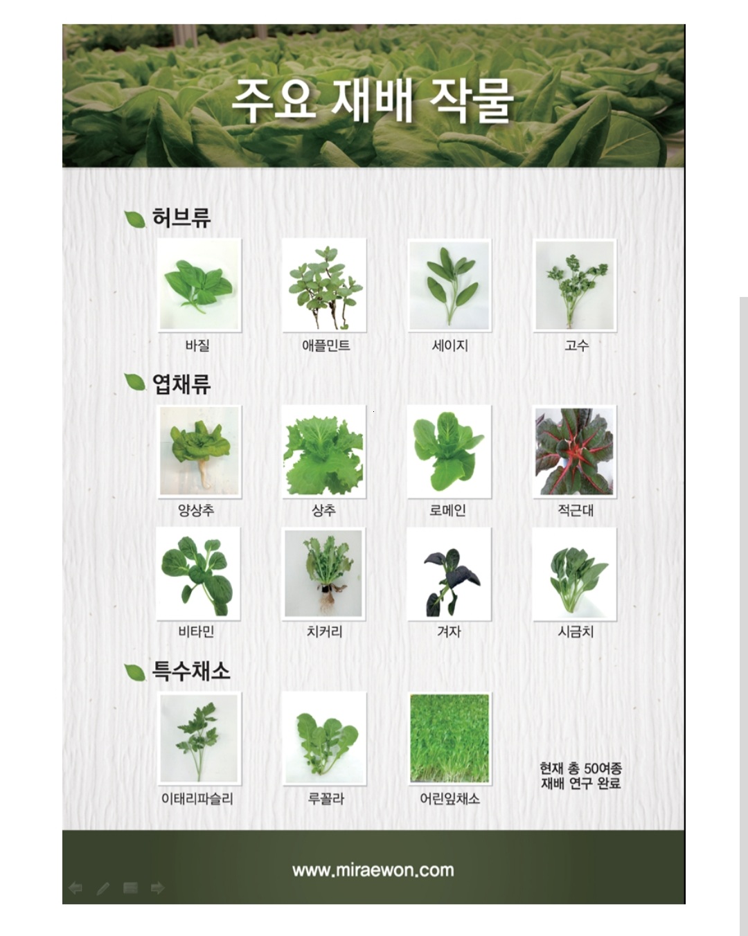 팜에이트에서 재배하는 주요 작물은 바질, 애플민트, 세이지, 고수, 양상추, 상추, 로메인, 적근대, 비타민, 치커리, 겨자, 시금치, 이태리파슬리, 루꼴라, 어린잎채소 현재 총 50여종 재배 연구 완료 했다고 한다!