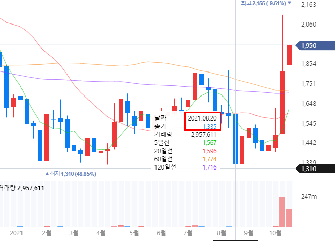 오늘(14일) 고가 2,155원 종가 1,950원이다.