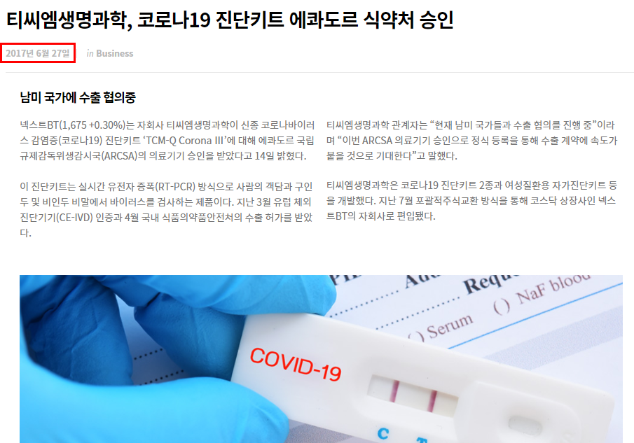 이때는 이슈는 FDA인증 받은 방호복과 자회사가 생산하는 진단기가 부각